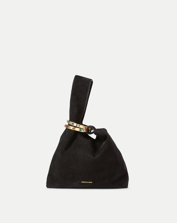 An RSVP-ready clutch with a cool, bohemian edge. Crafted from butter-soft Italian suede, the Swing features a small, slouchy body, accented with gold-toned double bracelets—embellished with semi-precious stones like malachite, lapis, amethyst, tiger’s eye, and sardonyx—that loop over the handle for secure, wristlet-style closure. Part bag, part jewelry, this wrist strap clutch is sure to make a statement no matter the occasion.