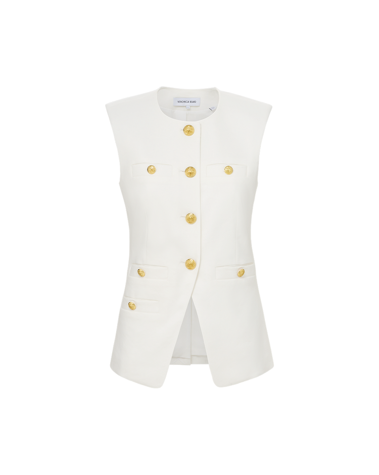 A fashion-forward take on the vest. Expertly tailored from stretch Linen, the Tamara is defined by an angled cutaway hem and bold gold crest buttons. Finished with four welt pockets, the style is chic on its own or as a top layer. Pair this linen vest with white pants for a high-impact matching set.