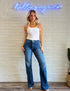 A high-rise bootcut with a zip fly, looser leg and a long 32-inch inseam with a clean hem. Made from semi-rigid SUPERIOR denim, Perfectly Imperfect is a dark blue with whiskering and fading at the knees.