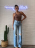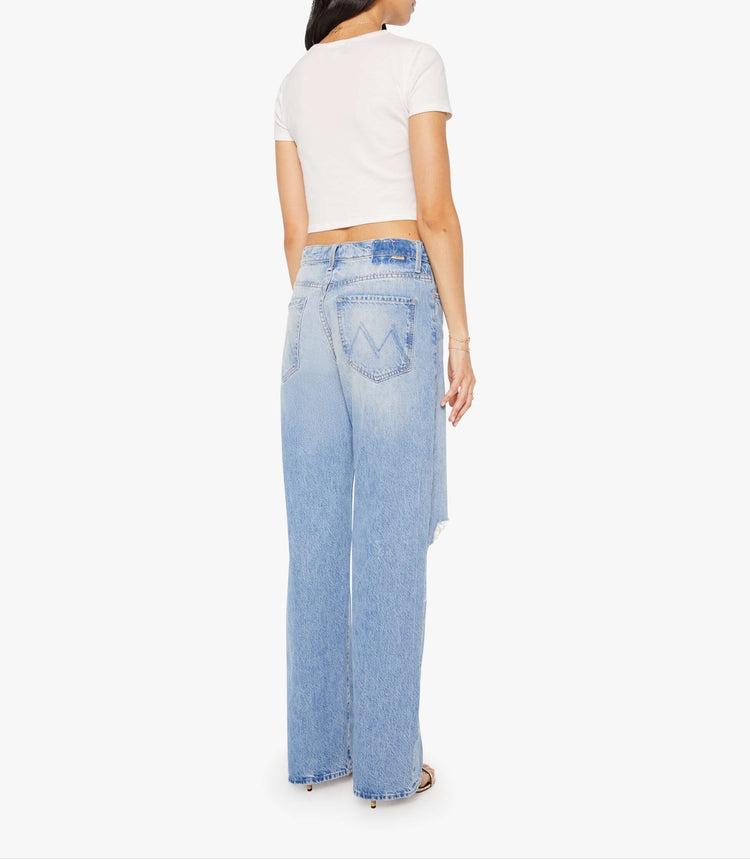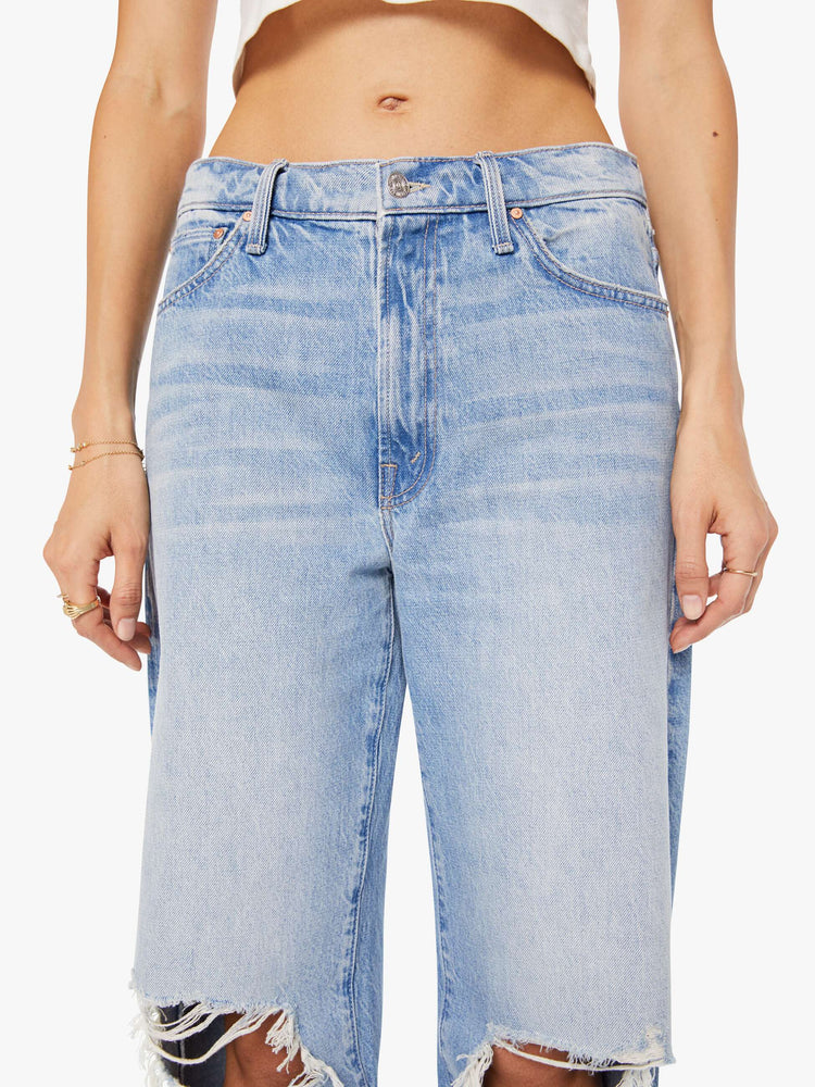 Field research. Jeans designed to sit on the hips with a zip fly, slouchy fit, loose straight leg and a 32-inch inseam with a clean hem. Made from rigid SUPERIOR denim, Floral Frenzy is a light blue with whiskering, fading and tears at the knees.