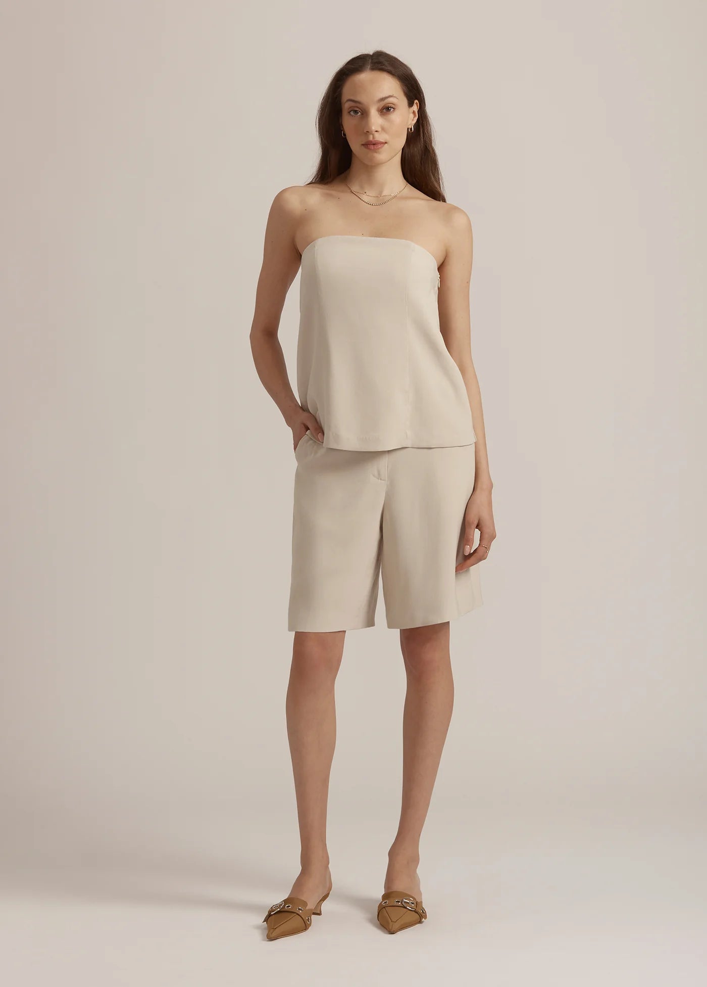 Cut from lightweight suiting fabric, The Olivia Bustier is chic styling at its best. With a fitted bodice that's a bit more relaxed around the hem, it’s also super comfortable thanks to the mesh inner construction and side zipper. Perfect with white denim (any denim, really) or paired with the matching Alexis Blazer and Dream Favorite Bermuda.
