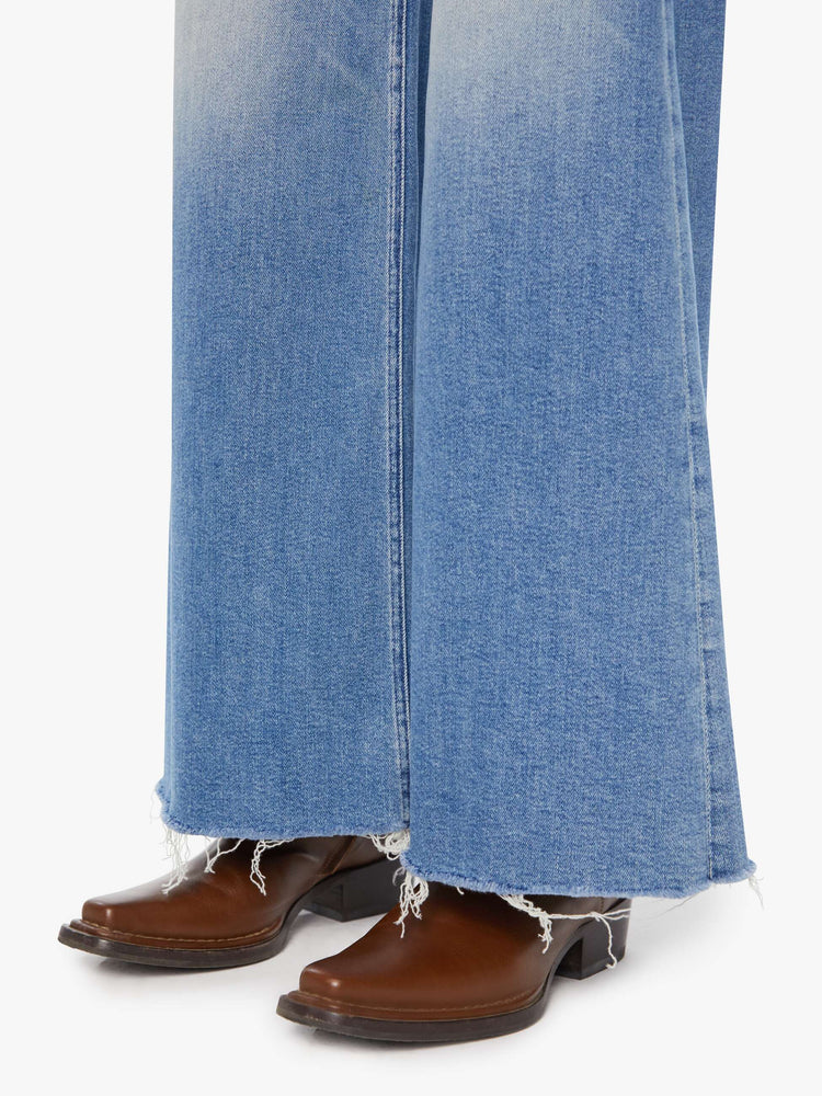 On a roll. High-waisted wide-leg jeans with a button fly, long 32-inch inseam and a frayed hem. Cut from stretch denim, Poppin' Wheelies is a mid-blue with whiskering and fading at the knees.
