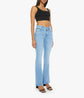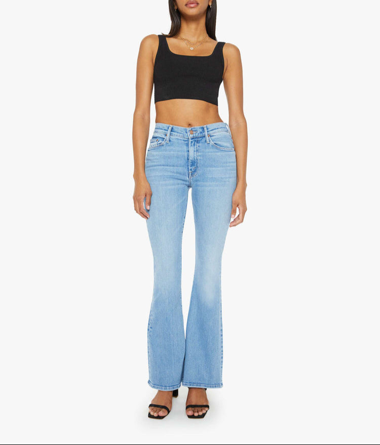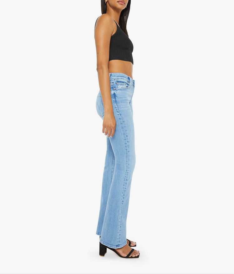 Twist of fate. This cult-favorite flare jean has a mid rise with a 31-inch inseam and a clean hem. Cut from stretch denim, Blessing In Disguise is a mid blue with subtle whiskering and fading at the knees.