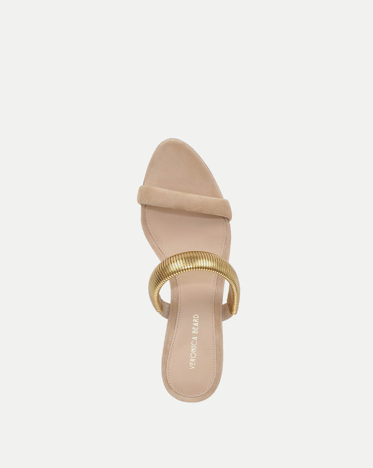 A minimalist sandal that makes a big statement. Crafted from premium beige suede, the Tobin features a double-strap design accented by a wide, ribbed gold-toned band across the midfoot, inspired by the iconic tubogas jewelry technique. With a mid-heel for ease, it transitions effortlessly from desk to dinner.