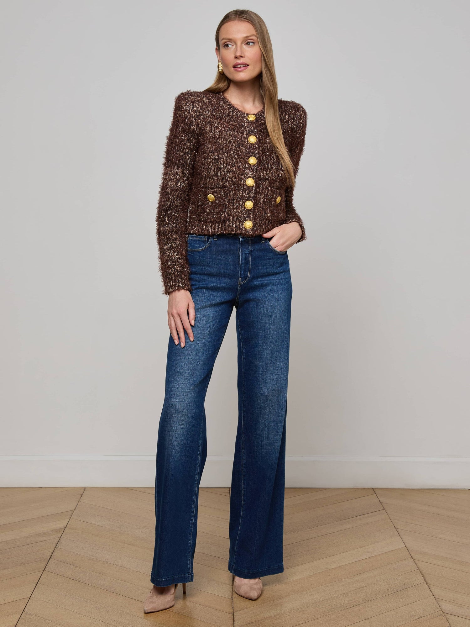 The Una is a richly textured knit cardigan that’s woven with a hint of lurex, adding subtle shimmer to this classic silhouette. Oversized buttons amp up the glam factor, while the boxy, cropped tailoring creates a trim and polished finish. Equal parts cozy and elevated, it’s a versatile layer that brings structure and shine to your look and works equally well as a top or cardigan.
