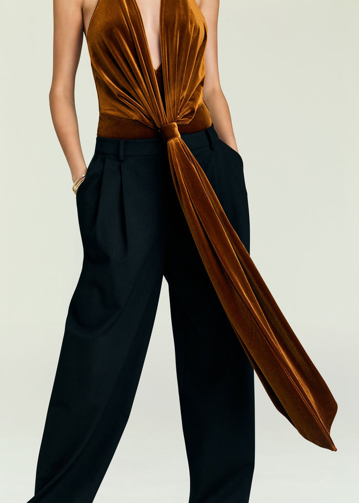Velvet, halter bodysuit with plunging neckline and open back. Long, front tie detail. Shown here in Marigold.