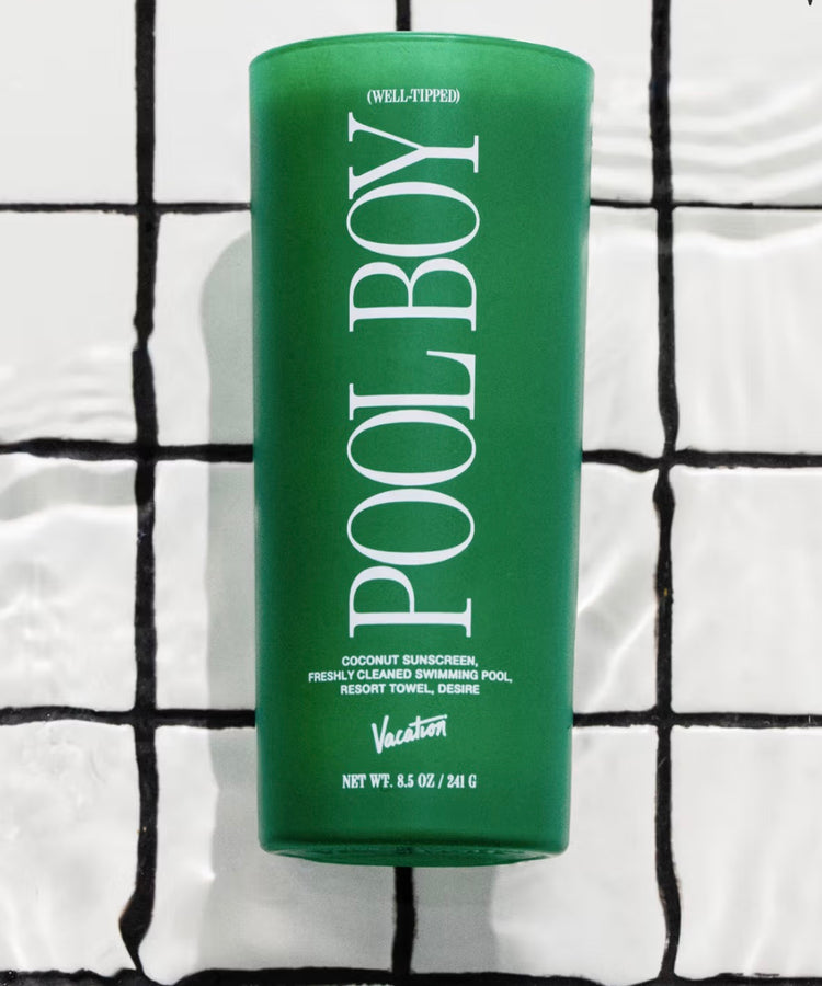 Tall, handsome and asked for by name, the “world-famous” Vacation® Brand “Pool Boy” scented candle is a (strictly platonic) olfactory affair of tropical romance, unchecked fantasy and over-attentive summer employment.