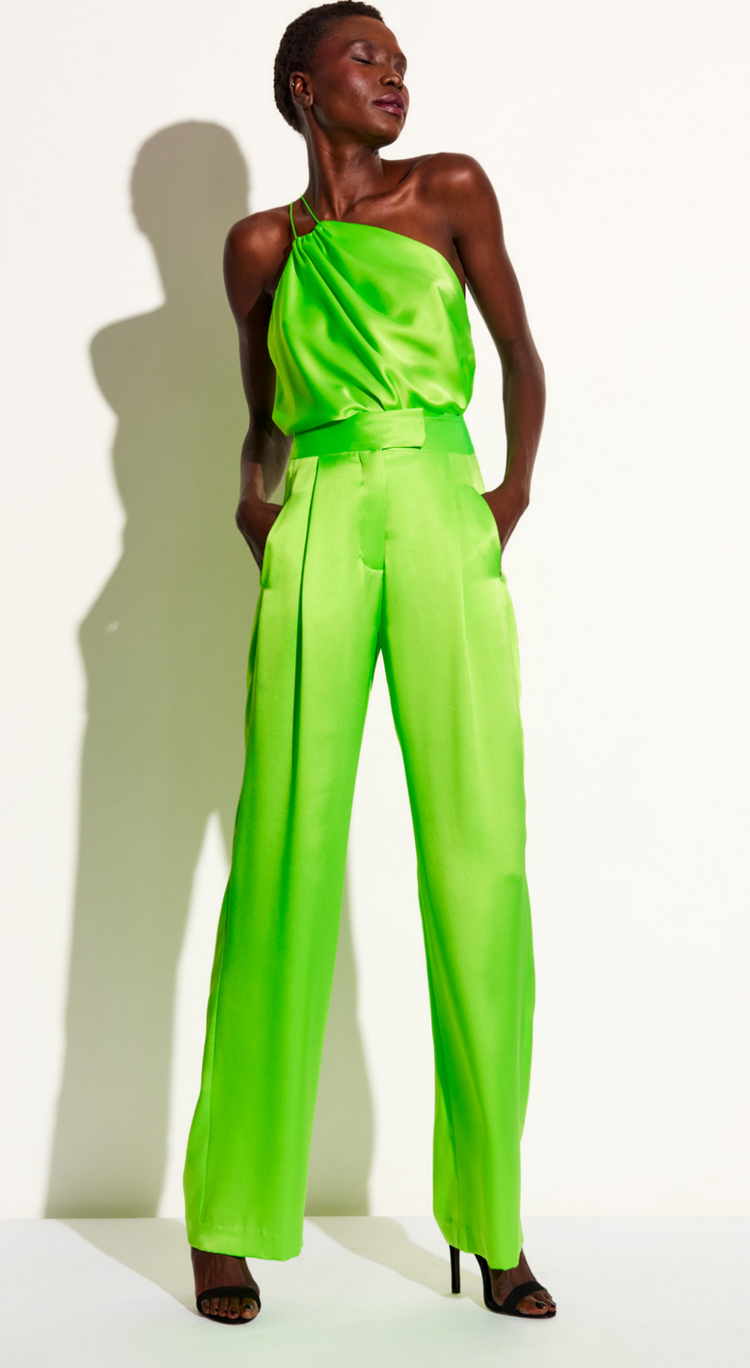 Fluid silk trousers with a high-gloss finish are cut in a pleated wide-leg silhouette.