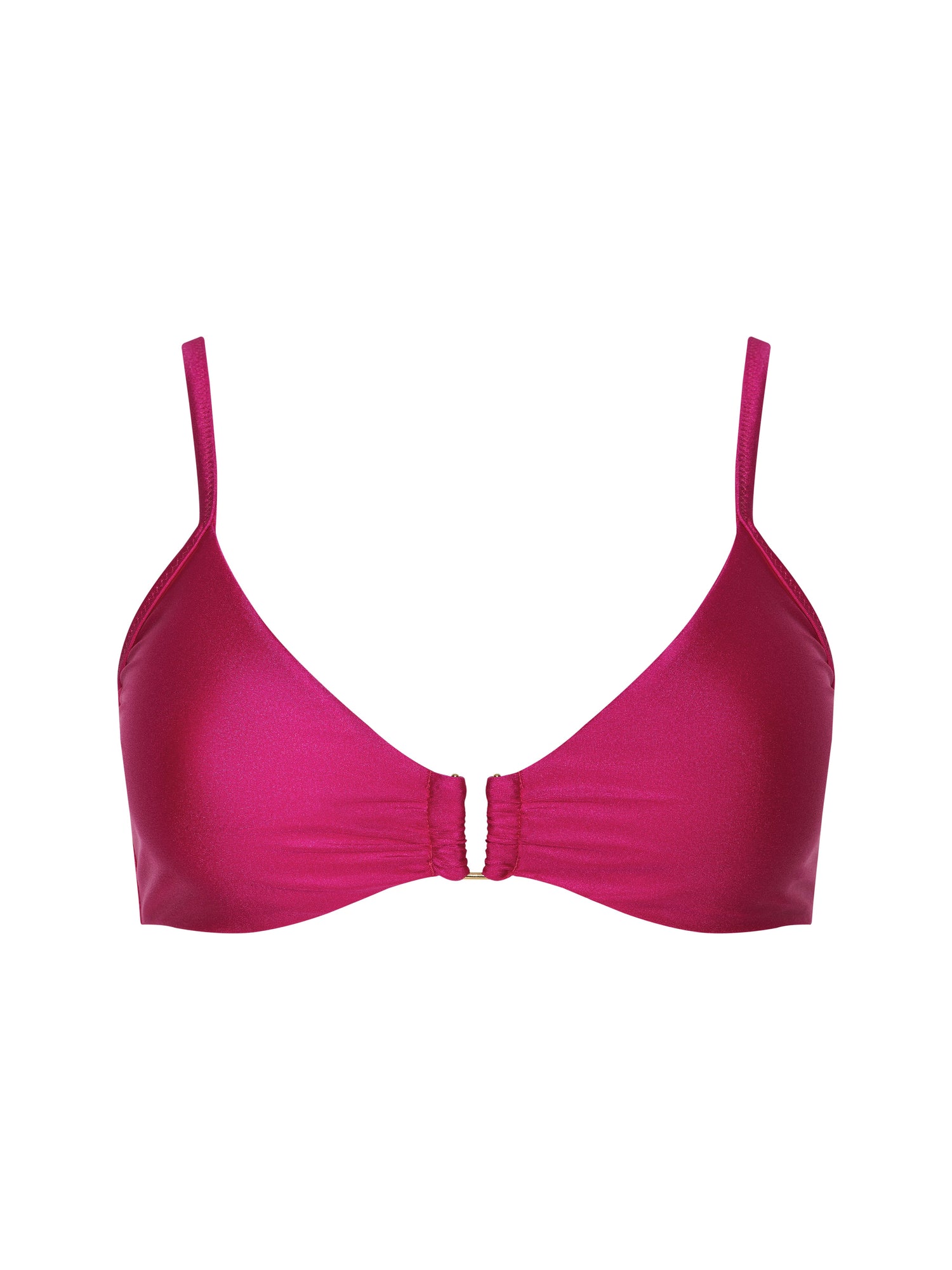 A sexy, secure fit bikini top, constructed with gold hardware. Now in fuchsia with a slight lustrous glow.